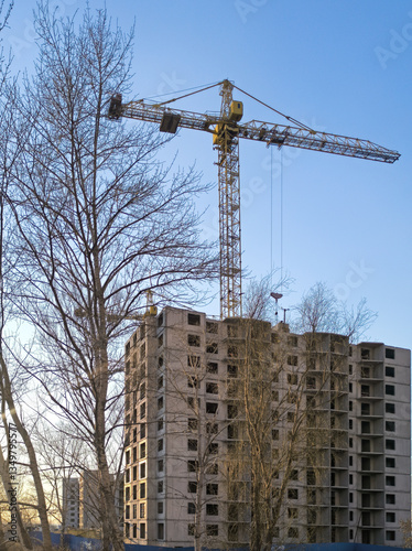 A building under construction with a crane in the foreground