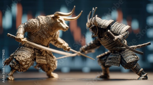 A bull and a bear dressed as samurai warriors fight with katanas against the background of financial charts