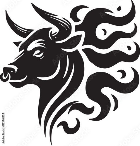 A bull head silhouette with a flame pattern in the horns vector black