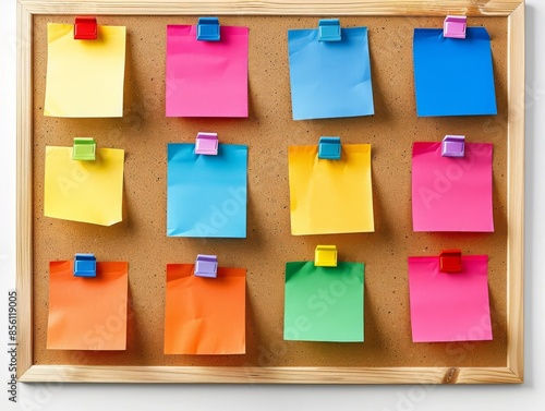 A bulletin board with colorful notes, realistic photo, clipping path, isolated on white background