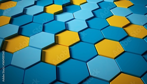 a bunch of blue and yellow hexagons are arranged in a pattern on a blue surface with a yellow center in the middle