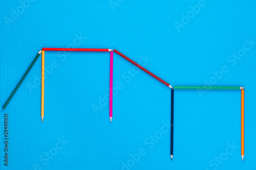 A bunch of crayons arranged in a pattern on a blue background , shot from above.