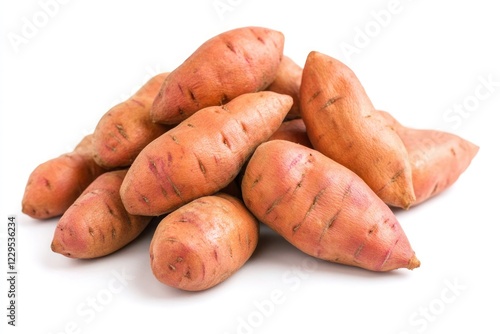 A bunch of deep orange sweet potatoes arranged in a pyramid-like formation, their rough, earthy skins in contrast with the smooth white background.