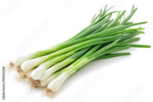 A bunch of fresh spring onions with vibrant green tops, isolated on white
