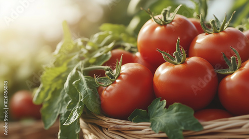 A bunch of fresh tomatoes in a woven basket, soft sunlight filtering through, bright outdoor setting, vibrant reds contrasting with lush green leaves, product ad style