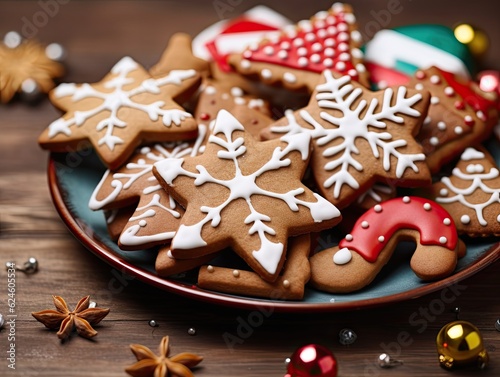 A bunch of freshly baked tasty colorful homemade Christmas cookies on a plate. Generative AI