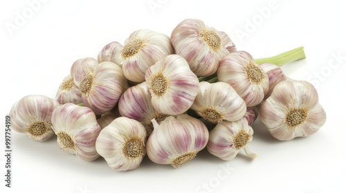 A bunch of garlic bulbs and cloves, all by themselves against a white backdrop.