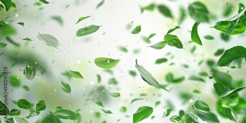 A bunch of green leaves suspended in mid-air, creating a sense of movement and dynamism