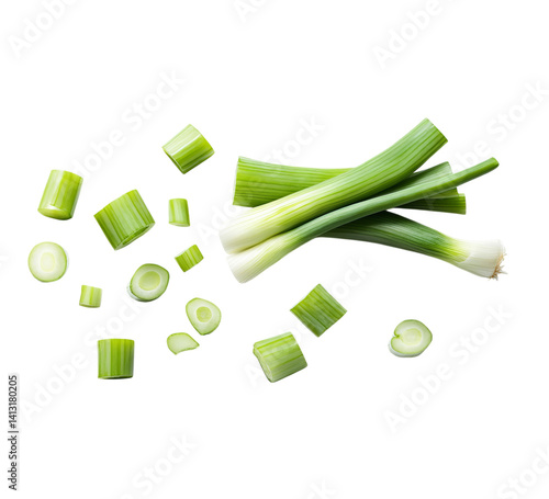 A bunch of green onions, sliced and cut into pieces on Png Format and Transparent Background