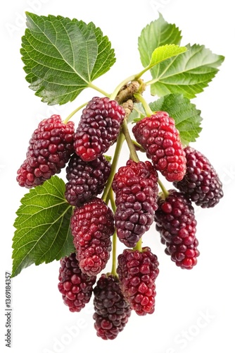 A Bunch of Ripe Mulberries Hanging from a Branch with Lush Green Leaves