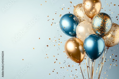 a bundle of balloons in various colors and textures, creating a festive atmosphere, with confetti