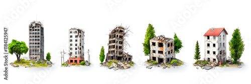 A bundle of destroyed post-apocalyptic houses in different stages isolated on a white background