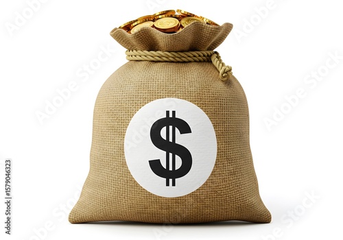 A burlap sack filled with gold coins and a dollar sign on a white background in a studio shot