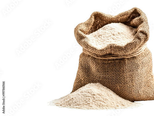 A burlap sack filled with white flour spilling onto a white surface. The sack is slightly tilted, revealing the flour inside.