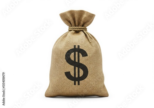 A burlap sack with a dollar sign on it isolated against a white colored plain studio background