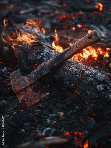 A burning fire with an axe lodged in its flames, ready for use