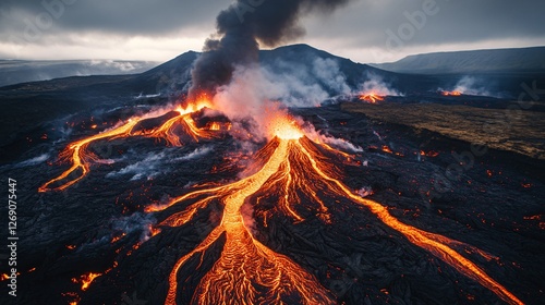A burning wasteland with volcanic eruptions and rivers of molten lava flowing through it