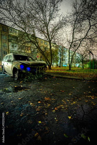 A burnt car stands right in the middle of the street, a car without an owner. Incident with a burnt car, a landscape on the street with a car that burned down. Heated hood and engine of a car