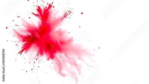 A burst of bright red Holi powder frozen in motion, creating a vivid and energetic display on a pure white background.