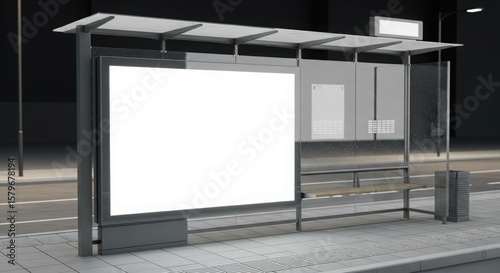 A bus stop with a blank advertising billboard under a shelter, featuring a bench and a dark background.