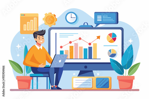 A business analyst reviews a growth graph on a large screen while seated at a desk in a contemporary office setting