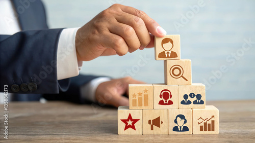 A business executive’s hand supporting a pyramid of wooden blocks with diverse customer icons, emphasizing team management, customer service, and leadership in business.