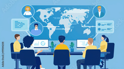 A business leadership team discussing cross-border leadership techniques in a virtual meeting, with representatives from various countries.