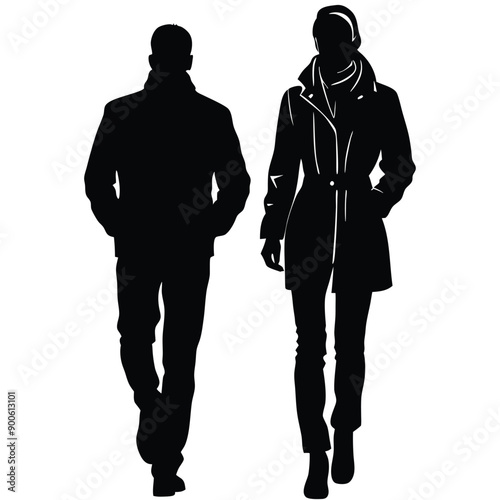 A business Man and woman are dressed in winter clothes. vector silhouette isolated white background