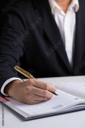 A business man looking serious in black suit writing on agenda with the gold pen.