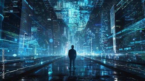 A business man stands in the center of an empty futuristic city, surrounded by glowing data streams and holographic screens.