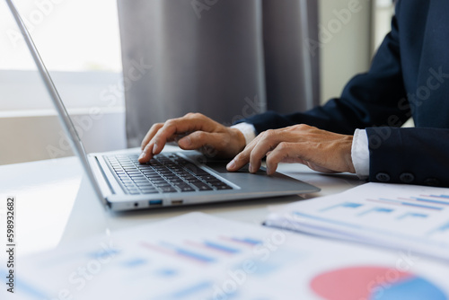 A business man working on a laptop comparing details from graphs Business income chart in real estate, tax, management, marketing, technology in private office.