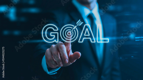 A business photo shows a hand in a dark suit touching glowing white 3D goal text with a dart-target icon on a deep teal blurred background