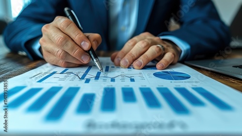 A business professional analyzes detailed financial charts and graphs on a document while working on a financial analysis at a desk with pen and suit, highlighting data-driven decision-making