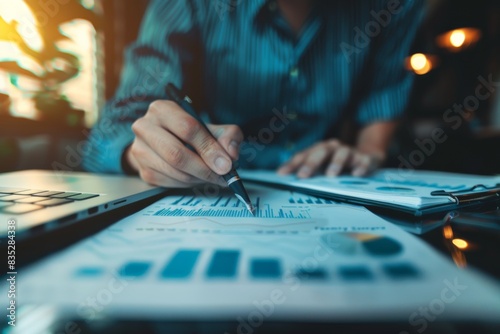 A business professional analyzing data with charts and a pen, illustrating strategic planning and analysis