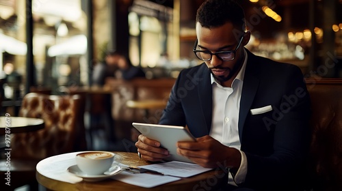 A business professional enjoying a cup of coffee while reviewing documents on a tablet in a trendy cafe