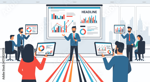 A business professional presenting data analytics and financial charts to colleagues during a corporate meeting or conference.