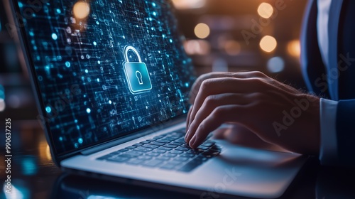 A business professional secures sensitive data on a laptop by entering information at a modern workspace during evening hours