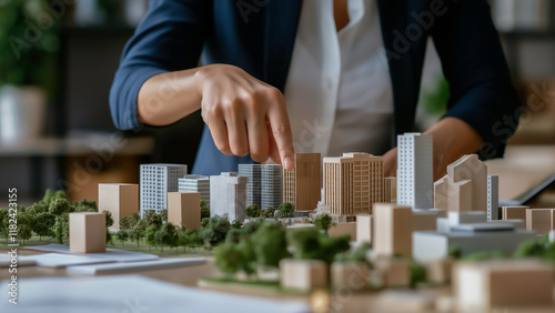 A business professional showcases an architectural model highlighting urban development and real estate planning in a modern office, innovative urban development strategies for future cities.