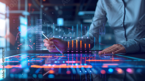 a business professional using a stylus to navigate through a digital business dashboard filled with real-time analytics, financial data, and interactive charts. The setting include