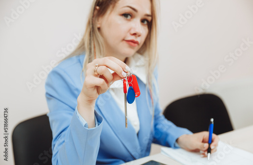 a business woman is sitting in an office and holding keys in her hand.