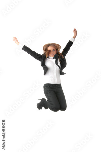 A business woman jumping with hands in the air