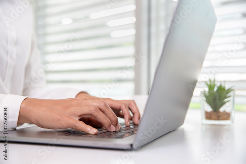A business woman sitting in front of a laptop in the office.Data analysis concept from summary graph statistics for business meeting executives. Graph, statistics, financial, management, accounting.