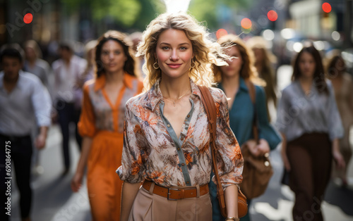 a business woman's smiling as she walks down the street on her way to work in summer