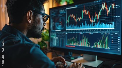 A businessman analyzes finance sales data and economic growth graph charts alongside blockchain technology, emphasizing analytics and financial and banking technology concepts.