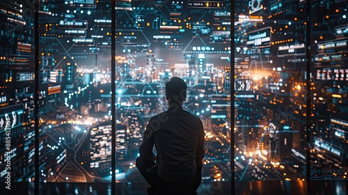 A businessman analyzing blockchain analytics and cryptocurrency market trends on a large digital display, highlighting the real-time data analysis and decision-making in financial markets.