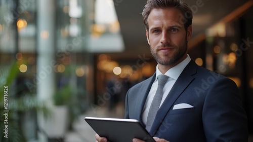 A businessman analyzing financial data on a tablet in a corporate setting. Perfect for illustrating growth strategies, investment, and business analytics.