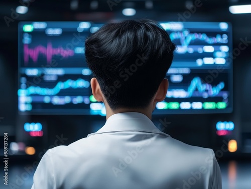 A Businessman Analyzing Forex Trading Graphs and Data on Digital Screens in the Office