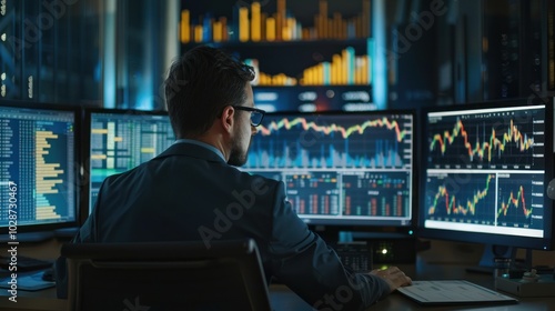 A Businessman Analyzing Stock Market Data on Multiple Monitors