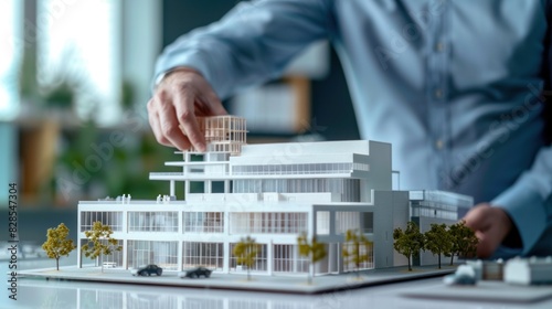 A businessman architect is presenting a new model of an industrial building for hotel or office construction projects.