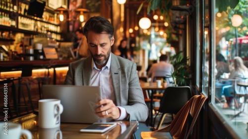 A businessman efficiently using a smartphone and a laptop at a bustling caf working on important business projects and engaging in mobile productivity